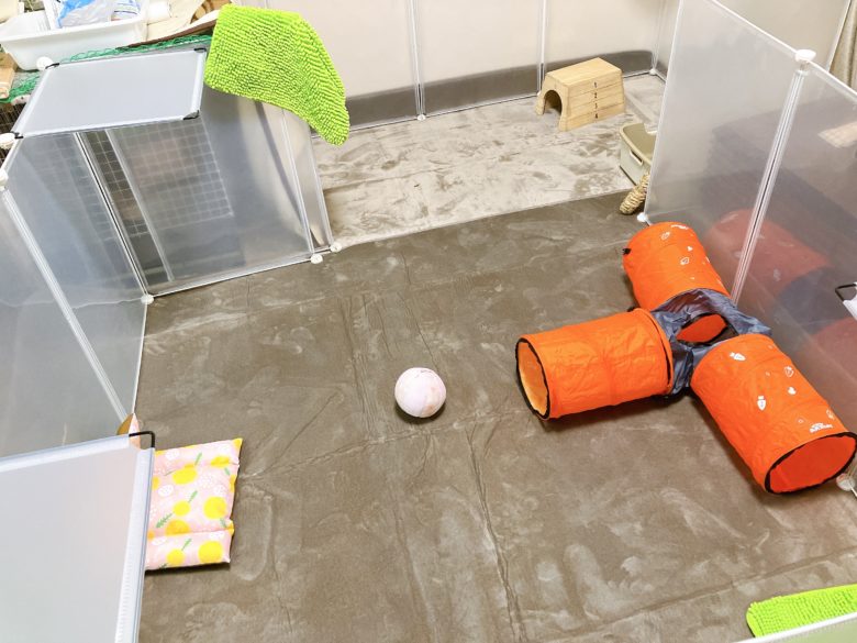 部屋んぽの範囲・走る場所・曲がる場所だけ敷くなどの方が管理しやすいです。
